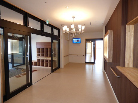 ![]() 1階サービス付き高齢者向け住宅用玄関ホール 正面の壁面に太陽光発電の発電状況などを表示するモニターを設置しています。 |